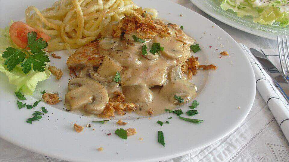 2. Als nachstes die Zwiebel abziehen und fein hacken. Den Schnittlauch abbrausen, trockenschütteln und fein hacken.Jeetzt die Champignons putzen, feucht abreiben, evtl. halbieren und im heißen Bratfett scharf anbraten. Die Zwiebel dazugeben und andünsten. Mit der Sahne ablöschen. Alles etwas einköcheln lassen. Die Pilzrahmsoße mit Salz sowie Pfeffer abschmecken und den Schnittlauch unterrühren.